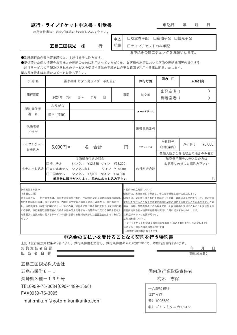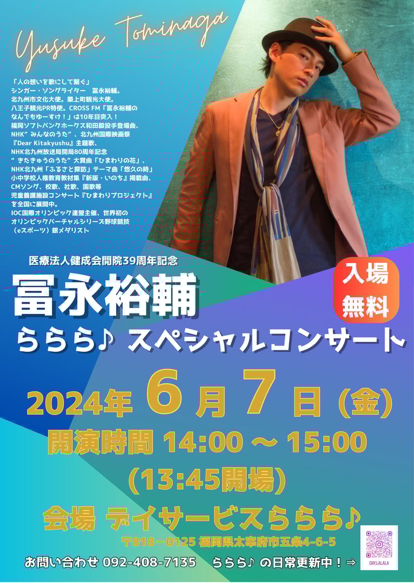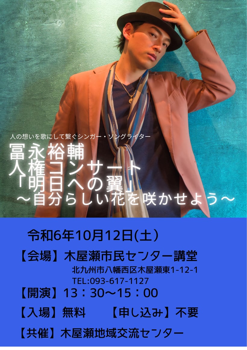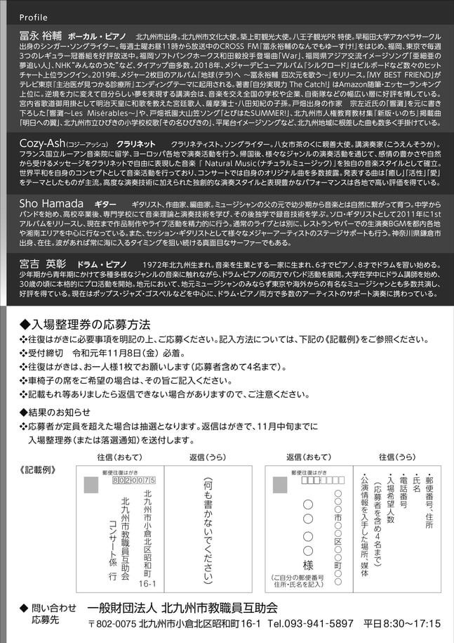 ・申し込み:FAX 093-682-1591まで<冨永裕輔ライブ希望、氏名、電話番号>をご記入の上お申込みください。