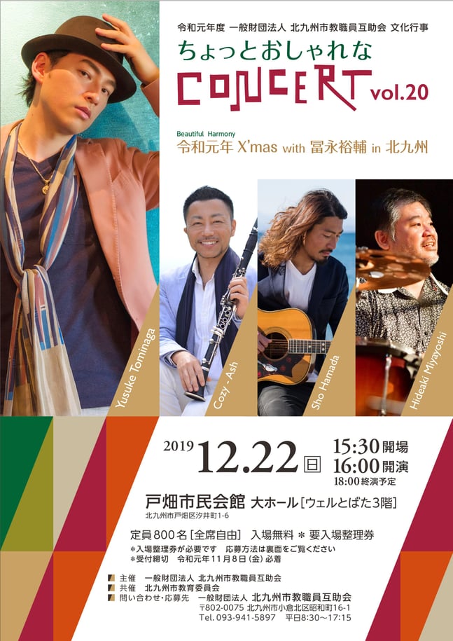 12/22(日)【LIVE】北九州戸畑市民会館大ホール 令和元年度一般財団法人北九州市教職員互助会文化行事『ちょっとおしゃれなCONCERT vol.20 ~令和元年(BeautifulHarmony)X’mas with 冨永裕輔 in 北九州~』16時〜