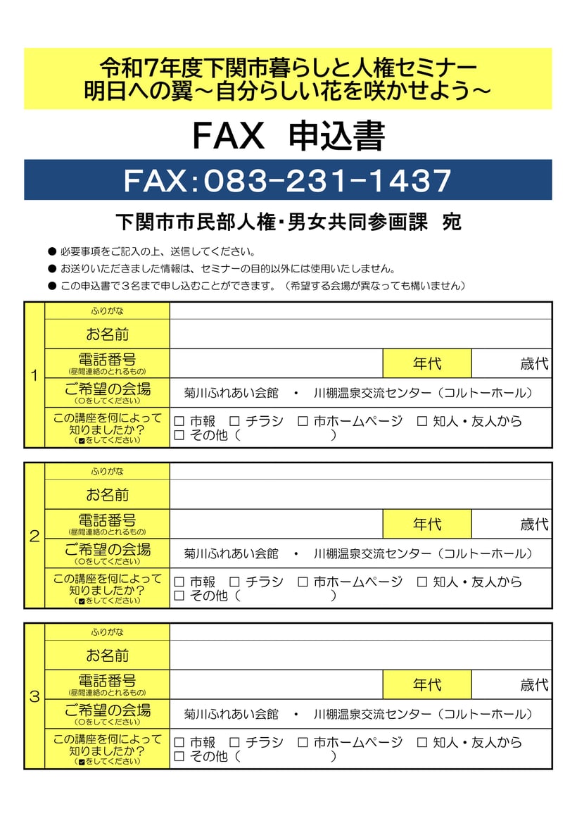 下関市市民部人権・男女共同参画課 電話 083-222-0827 FAX 083-231-1437