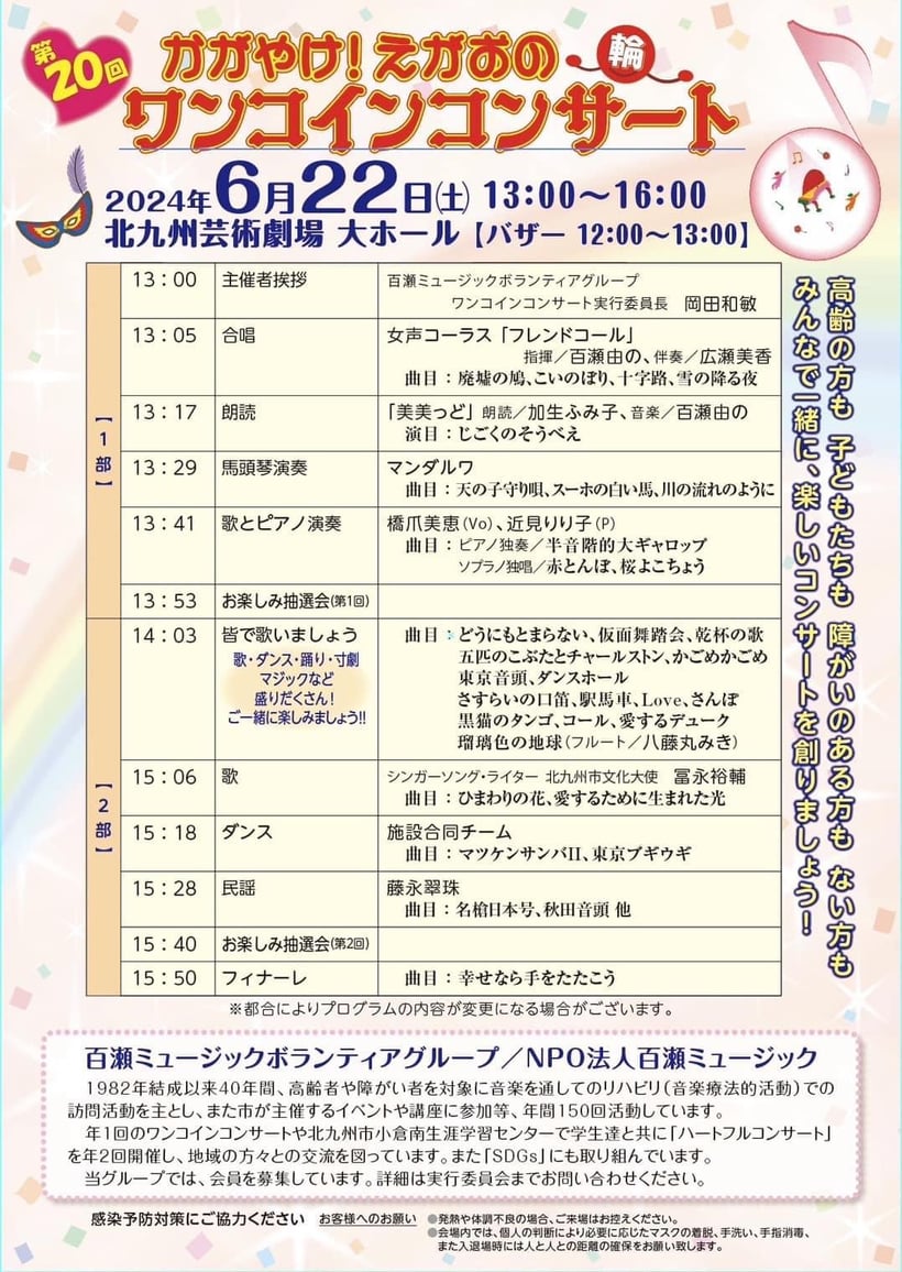 冨永裕輔作詞作曲のひびきの小学校校歌、くきのうみ小学校校歌をひびきのジュニアコーラスの皆さんと合唱するコーナーもあります!